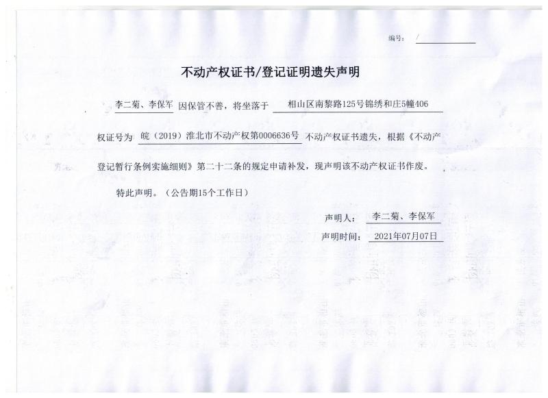 李二菊、李保军不动产权证书/登记证明遗失声明