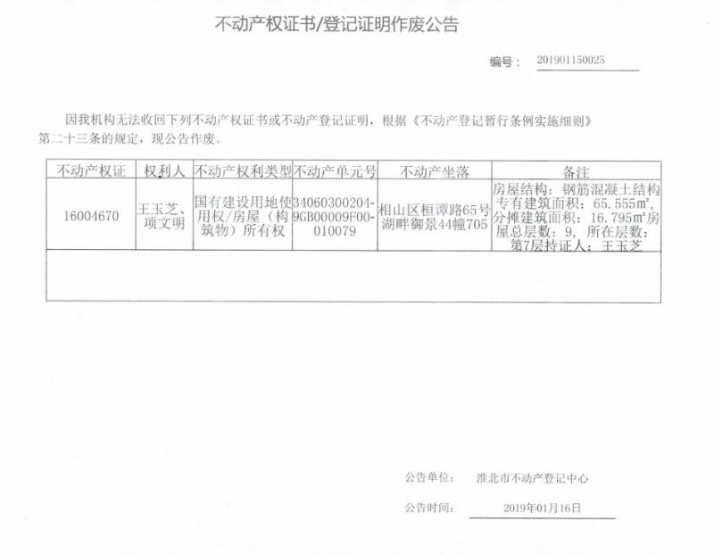 王玉芝 项文明 不动产权证书/登记证明作废公告