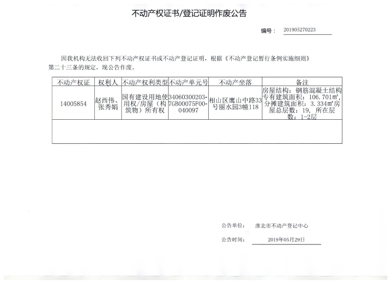 赵西伟 张秀娟 不动产权证书/登记证明作废公告