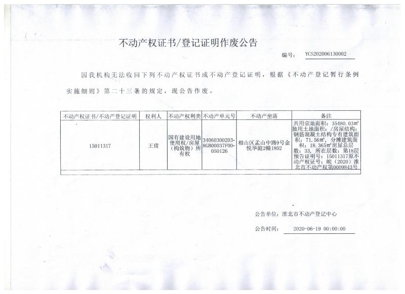 王倩不动产权证书/登记证明作废公告