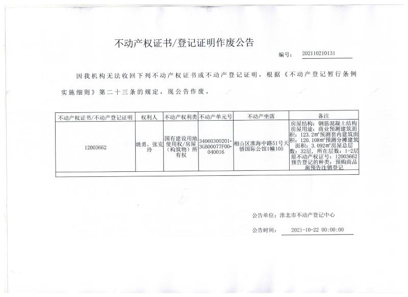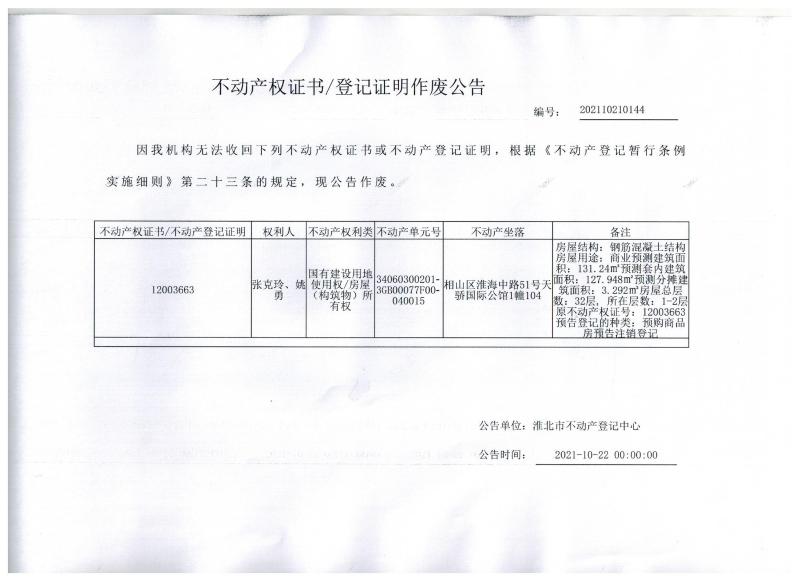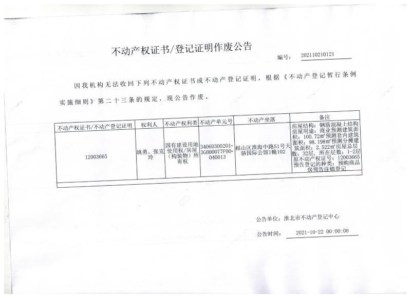 姚勇、张克玲不动产权证书/登记证明作废公告