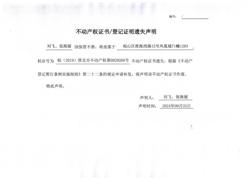 刘飞、张海丽不动产权证书/登记证明遗失声明