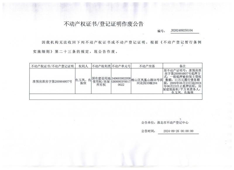 仇玉凤、仇振侠不动产权证书/登记证明作废公告