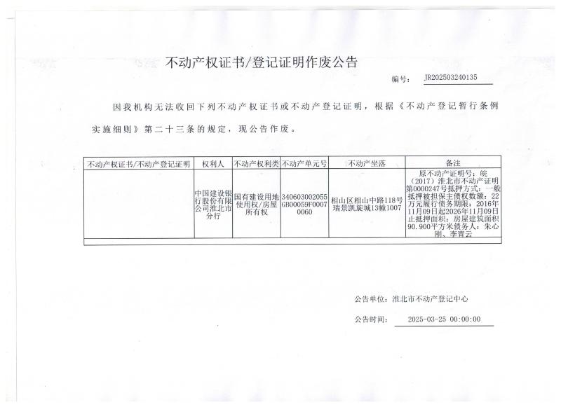 中国建设银行股份有限公司淮北市分行不动产权证书/登记证明作废公告