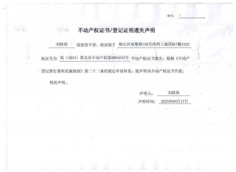 刘桂珍不动产权证书/登记证明遗失声明