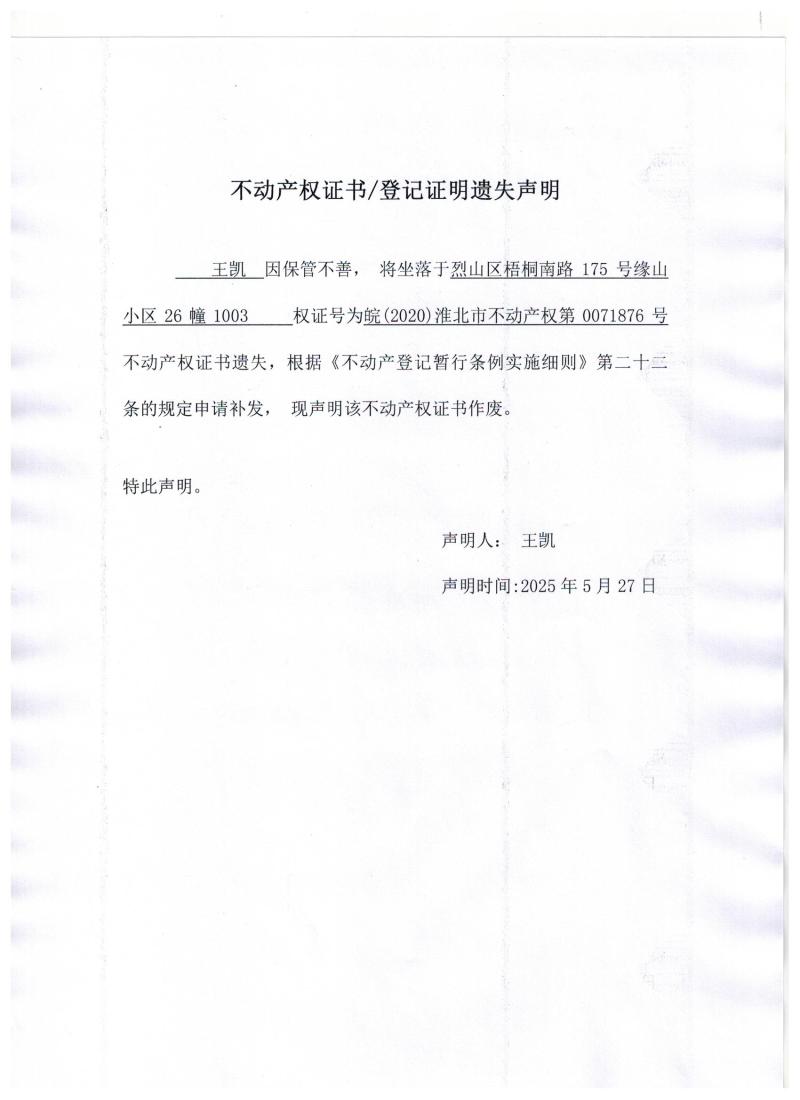 王凯不动产权证书/登记证明遗失声明