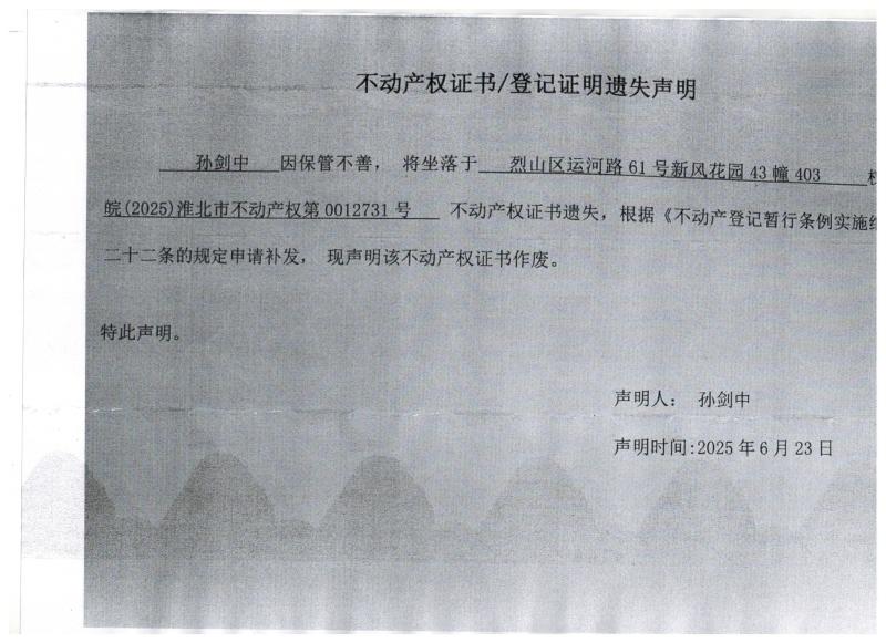 孙剑中不动产权证书/登记证明遗失声明