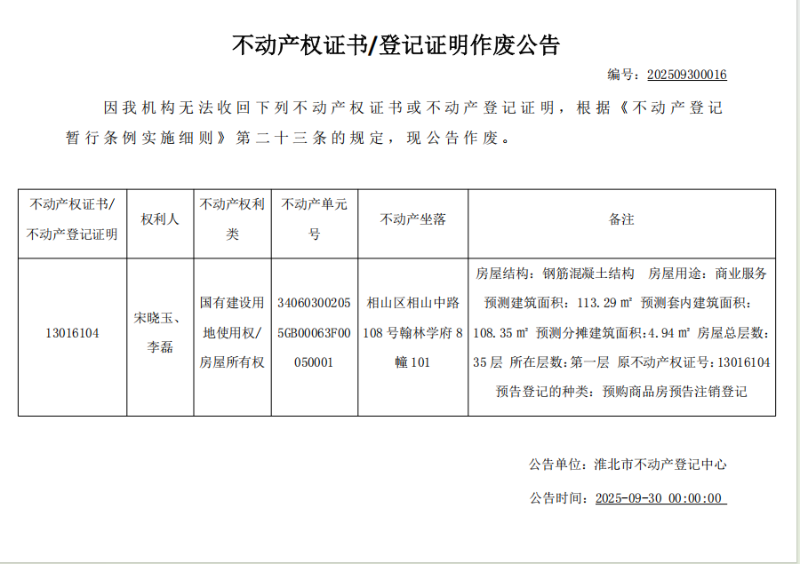 宋晓玉、李磊不动产权证书/登记证明作废公告