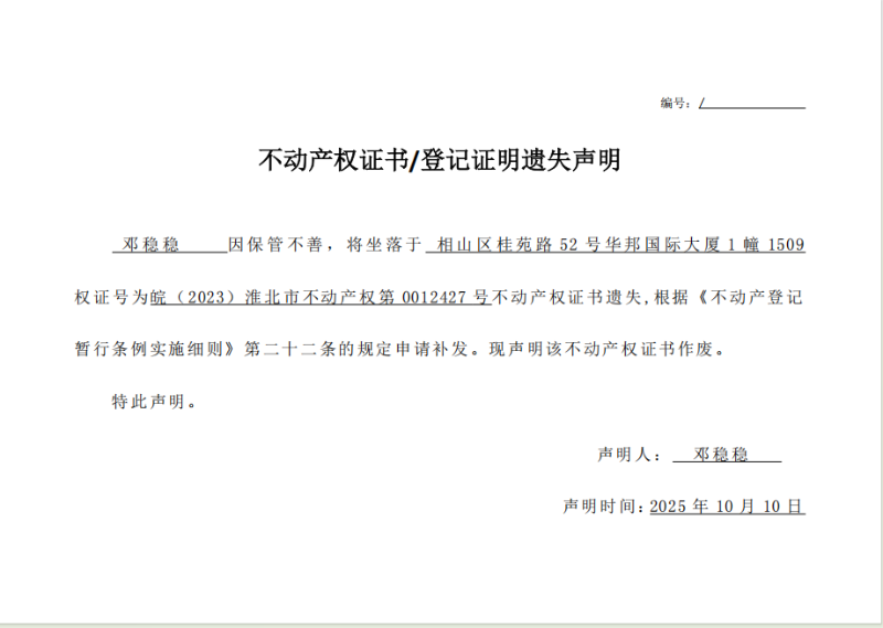 邓稳稳不动产权证书/登记证明遗失声明