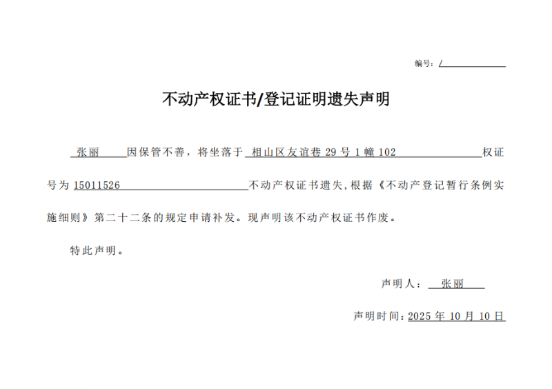 张丽不动产权证书/登记证明遗失声明