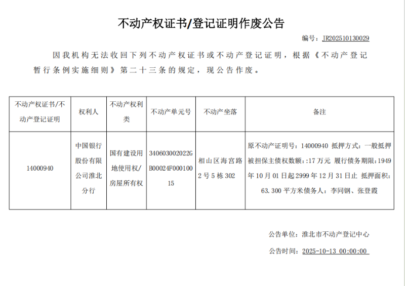 中国银行股份有限公司不动产权证书/登记证明作废公告