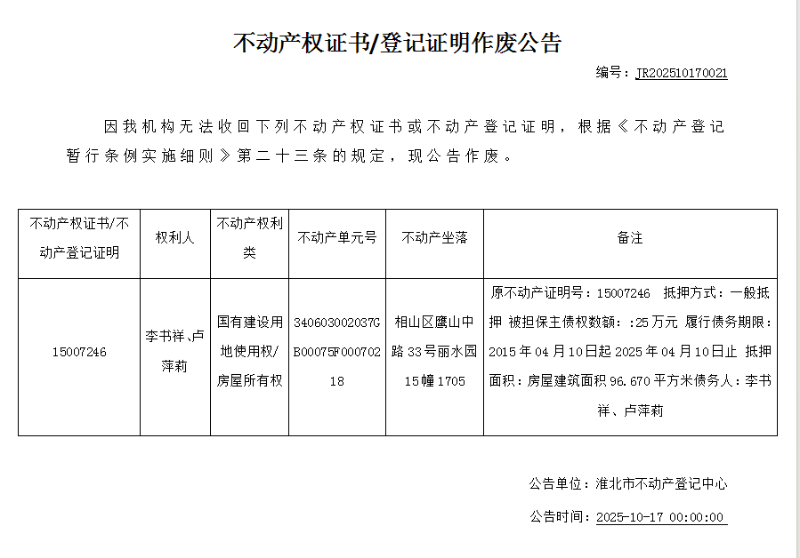 李书祥、卢萍莉不动产权证书/登记证明作废公告