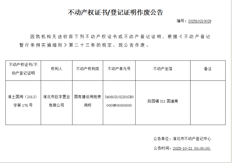 淮北市巨宇置业有限公司不动产权证书/登记证明作废公告