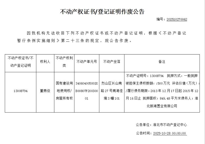 董燕俊不动产权证书/登记证明作废公告