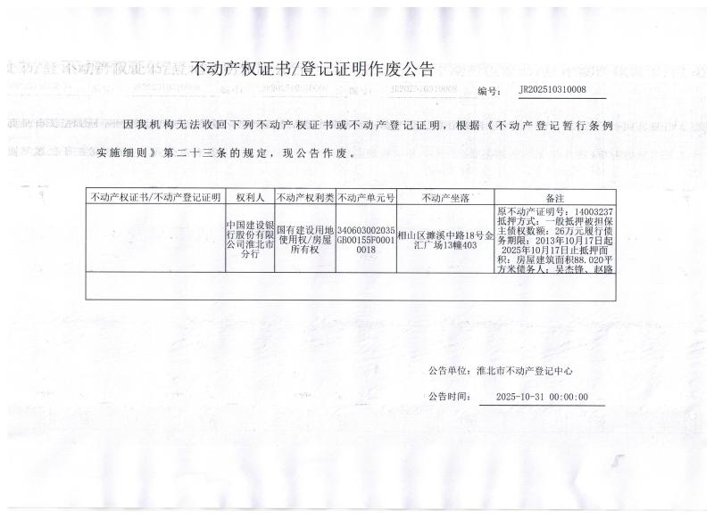 中国建设银行股份有限公司淮北市分行不动产权证书/登记证明作废公告