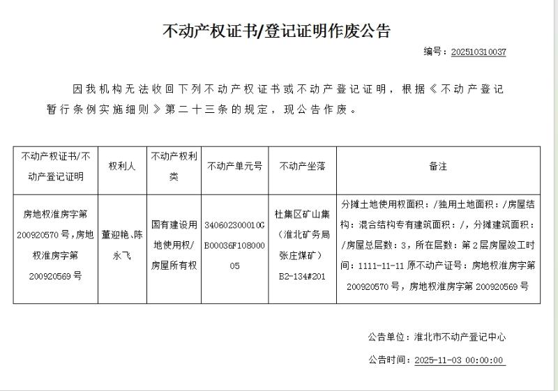 董迎艳、陈永飞不动产权证书/登记证明作废公告