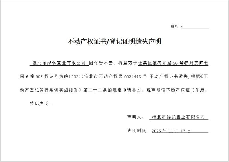 淮北市绿弘置业有限公司不动产权证书/登记证明遗失声明