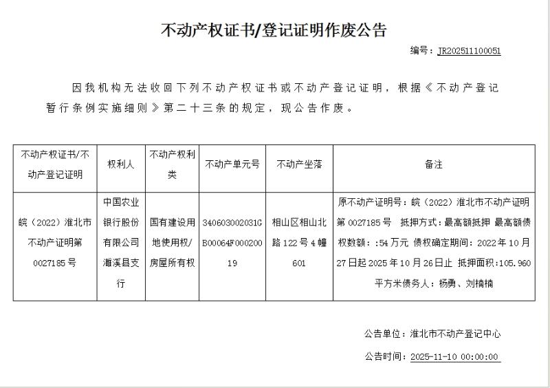 中国农业银行股份有限公司濉溪县支行不动产权证书/登记证明作废公告