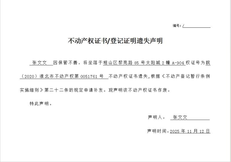 张文文不动产权证书/登记证明遗失声明