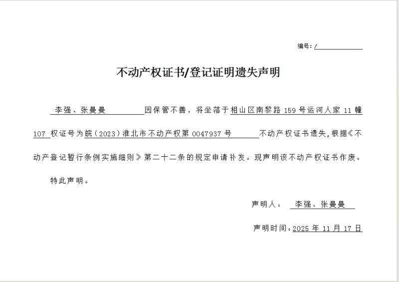 李强、张曼曼不动产权证书/登记证明遗失声明