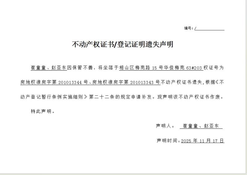 崔童童、赵亚东不动产权证书/登记证明遗失声明