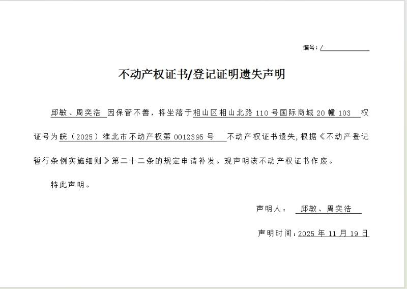 邱敏、周奕浩不动产权证书/登记证明遗失声明