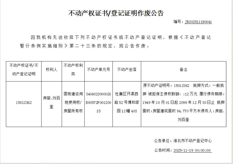 房丽、刘百奎不动产权证书/登记证明作废公告