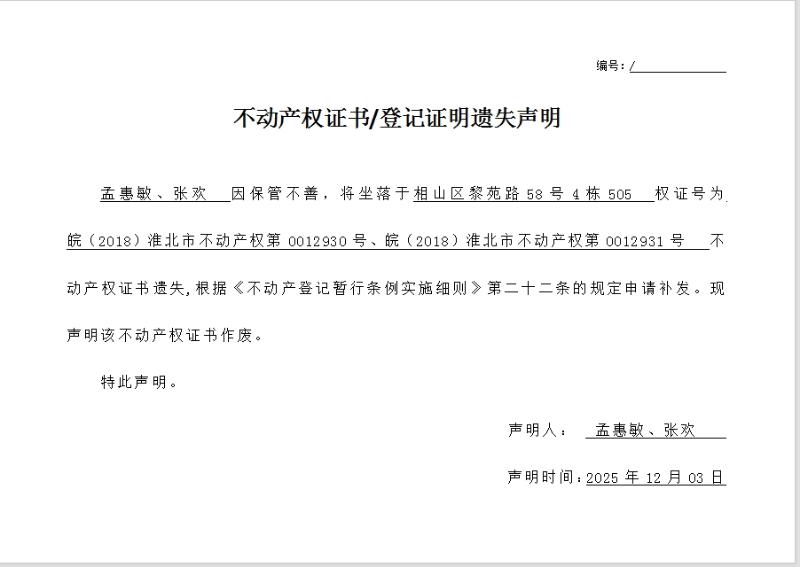 孟惠敏、张欢不动产权证书/登记证明遗失声明