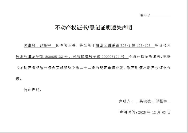 吴淑敏、邵振宇不动产权证书/登记证明遗失声明