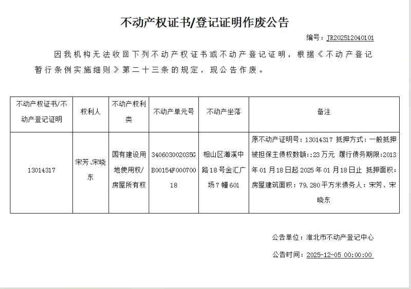 宋芳、宋晓东不动产权证书/登记证明作废公告