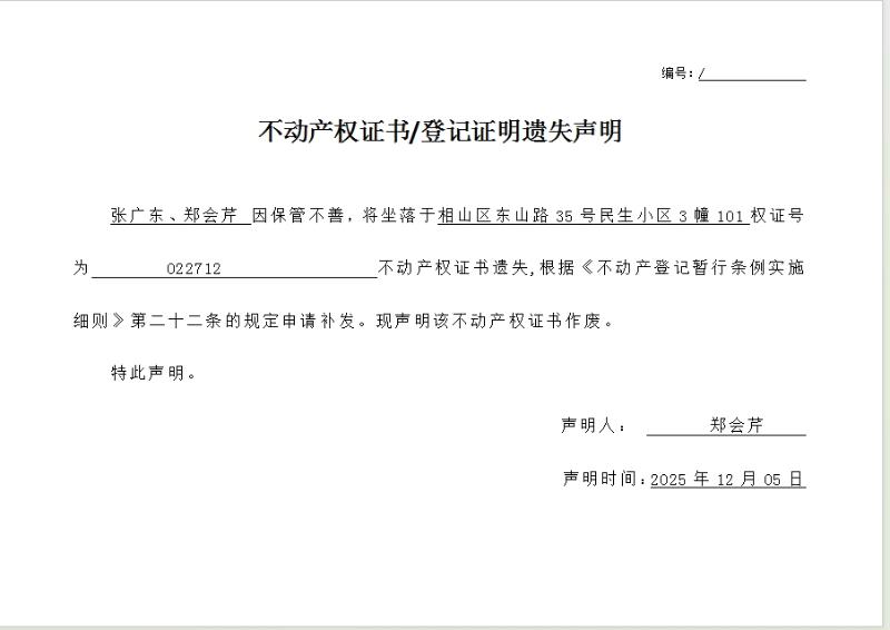 张广东、郑会芹不动产权证书/登记证明遗失声明