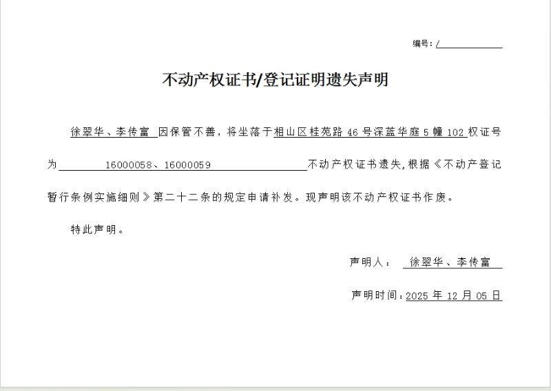 徐翠华、李传富不动产权证书/登记证明遗失声明