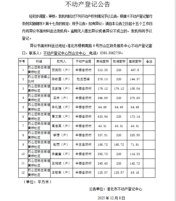 烈山区杨庄街道黄桥社区、古饶镇山北村不动产登记公告