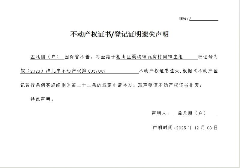 孟凡朋(户)不动产权证书/登记证明遗失声明