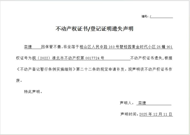 栾捷不动产权证书/登记证明遗失声明