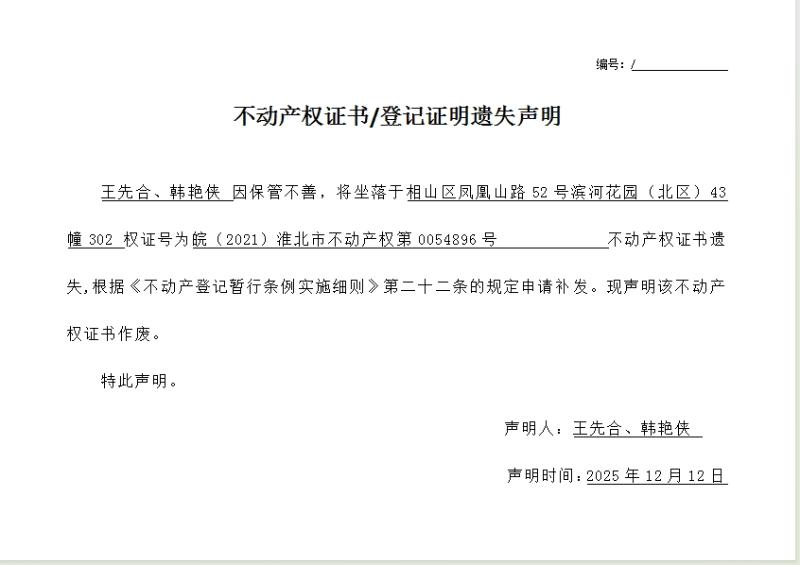 王先合、韩艳侠不动产权证书/登记证明遗失声明