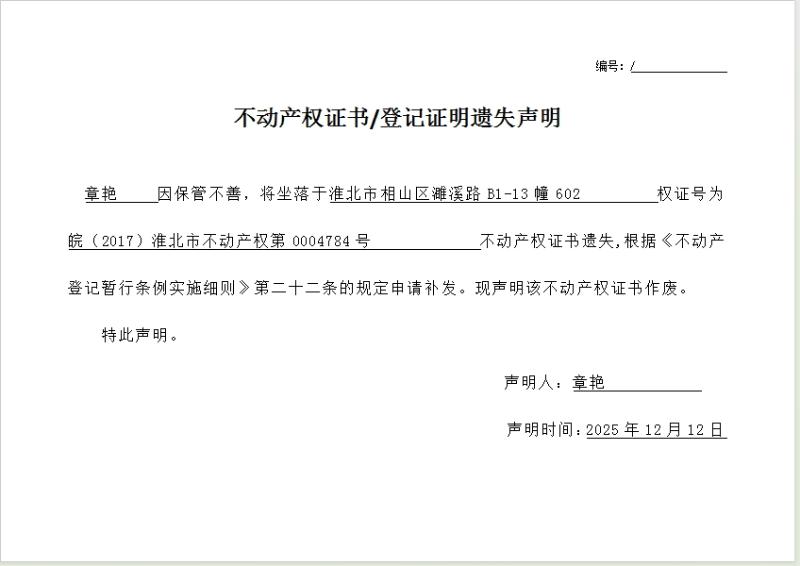 章艳不动产权证书/登记证明遗失声明
