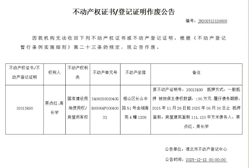 蔡贞红、周长学不动产权证书/登记证明作废公告