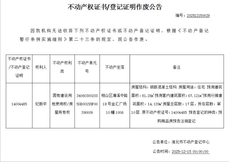 纪新中不动产权证书/登记证明作废公告