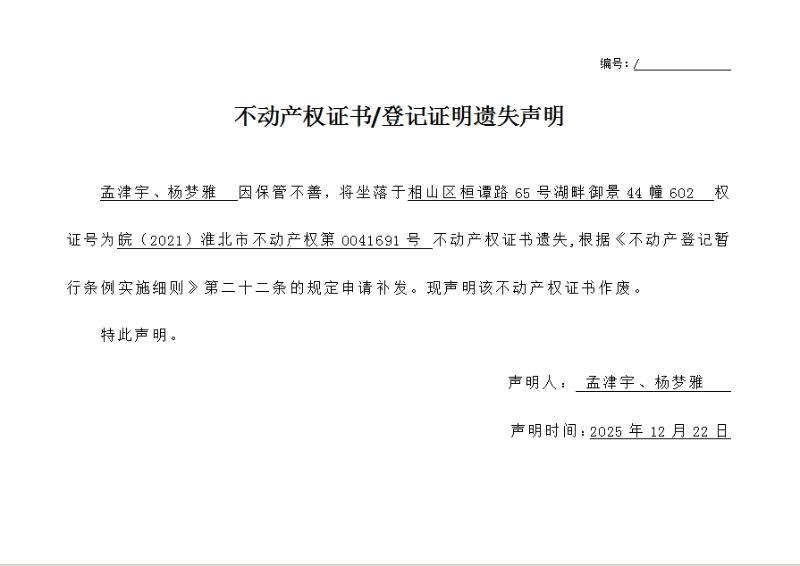 孟津宇、杨梦雅不动产权证书/登记证明遗失声明