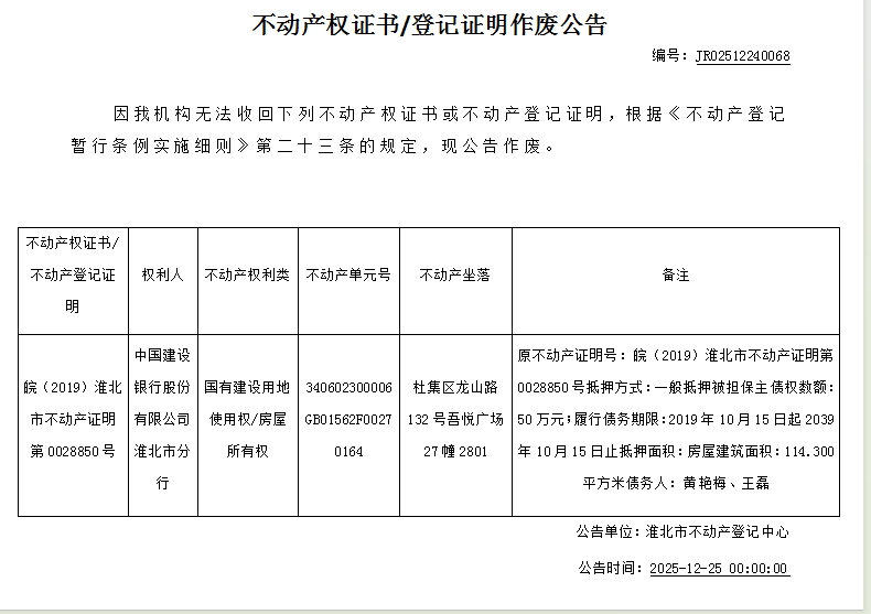 中国建设银行股份有限公司淮北市分行不动产权证书/登记证明作废公告