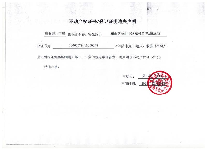 周书影、王峰不动产权证书/登记证明遗失声明