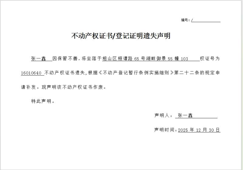 张一鑫不动产权证书/登记证明遗失声明