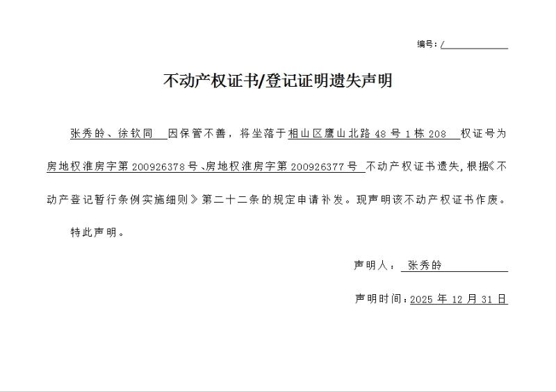 张秀皊、徐钦同不动产权证书/登记证明遗失声明