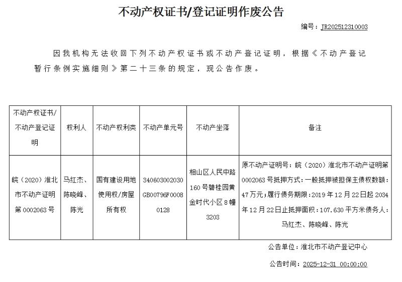 马红杰、陈晓峰、陈光不动产权证书/登记证明作废公告