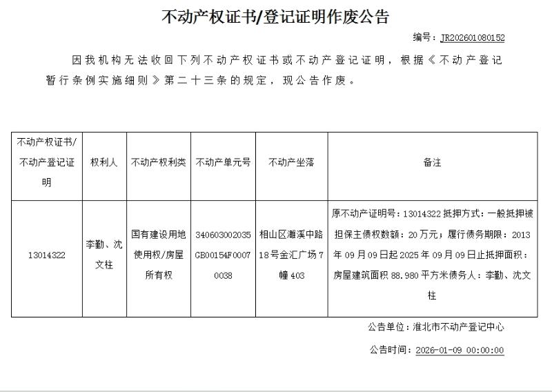 李勤、沈文柱不动产权证书/登记证明作废公告