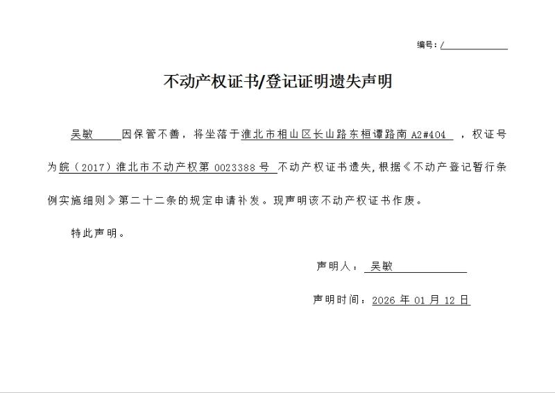 吴敏不动产权证书/登记证明遗失声明