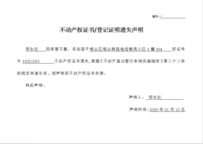 郑永红不动产权证书/登记证明遗失声明