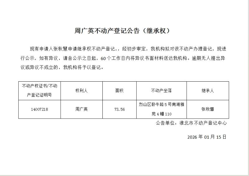 周广英不动产登记公告(继承权)