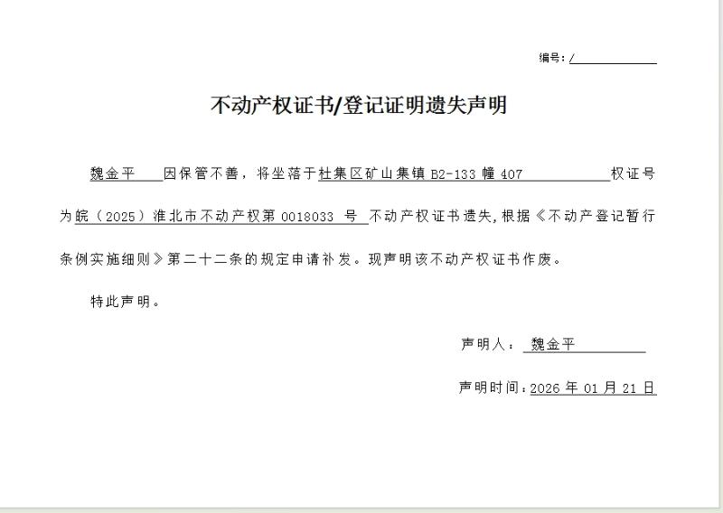 魏金平不动产权证书/登记证明遗失声明